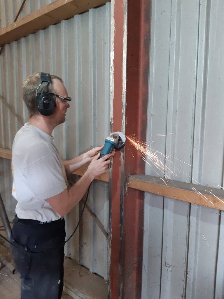 Donderdag 12 mei heeft Landbouwmechanisatiebedrijf Beuving uit Ruinen de laswerkzaamheden afgerond ter versteviging van de staanders. De staanders van de spanten waren al vrij stevig en voldeden nog net aan de huidige normen voor de constructiesterkte. Deze normen zijn overigens verzwaard ten opzichte van het moment van de bouw van de loods in de jaren 90, onder andere voor extremere weersomstandigheden. Maar het bevestigen van zonnepanelen op het dak geeft volgens de huidige normen bij bepaalde omstandigheden een te zware belasting. Tegen de staanders (I-profielen van al 270 mm) zijn dus H-profielen van 120 mm gelast. Dat kan heel wat sneeuw en storm doorstaan!